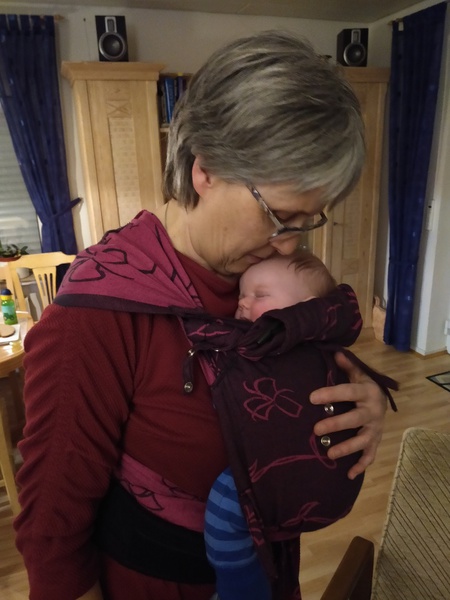 1. Die kleine Elena (mittig im Arm von Lotta) ist leichter als ein gewöhnliches Neugeborenes. Mit ihren 45 cm Länge und ca. 2200 g ist sie die Kleinste in der Runde. Mit ihr können auch Schwangere noch das Einbinden üben, weil sie auch über den Babybauch gebunden werden kann.